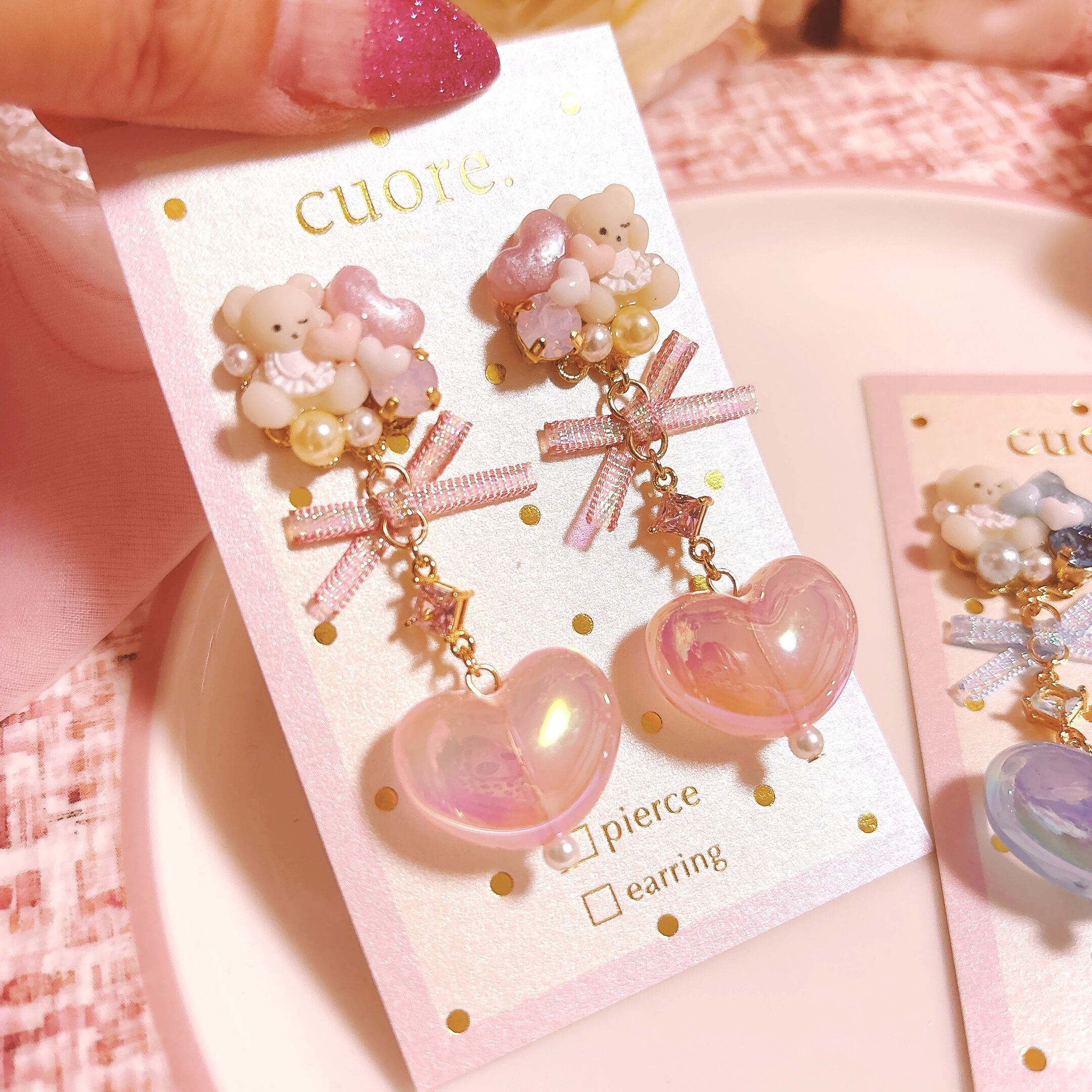 ぷっくりオーロラのハートと貴和クリスタル、ラメリボンと合わせることでキラキラ可愛く、大人可愛い印象に。