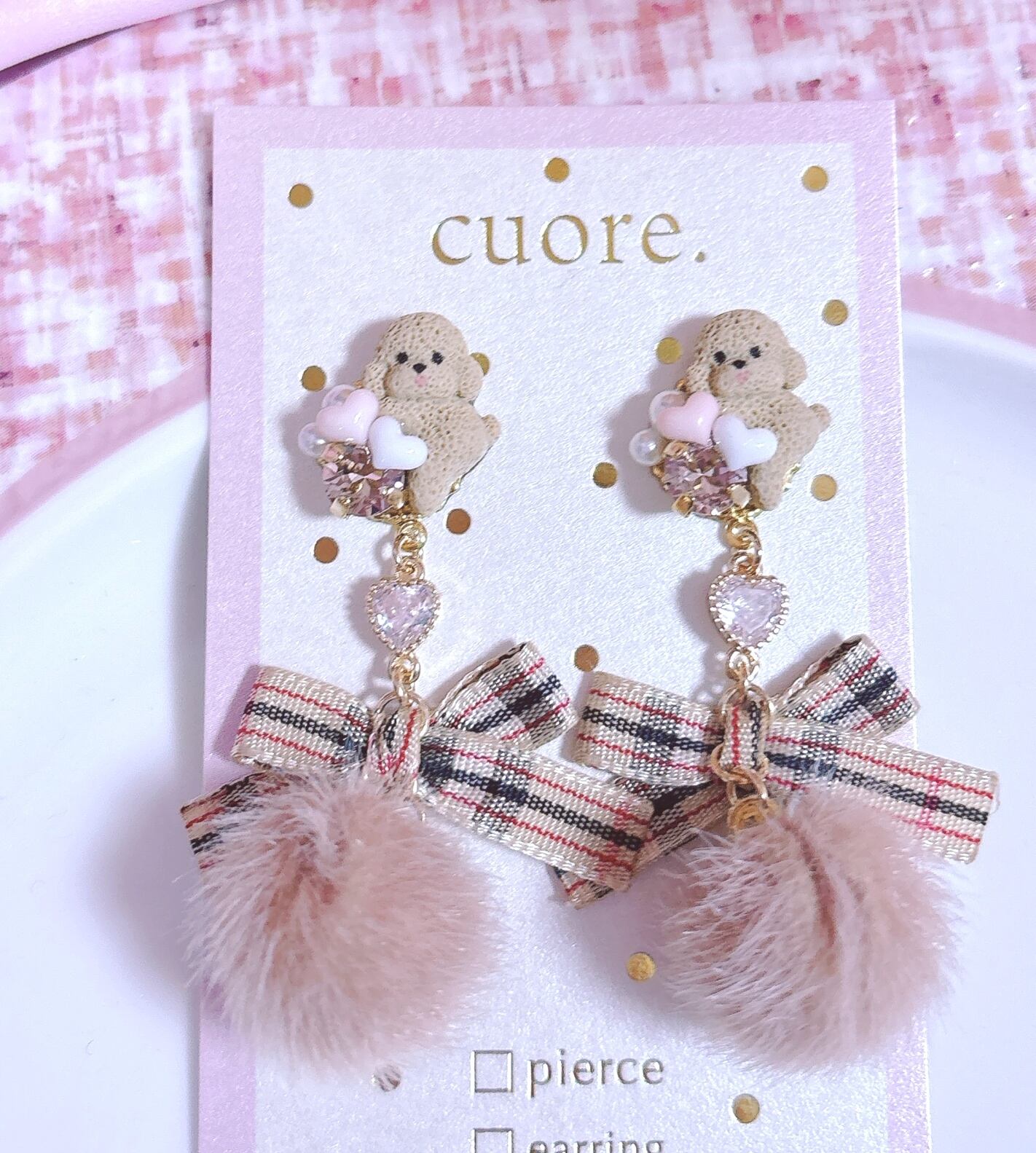 ちょこんと乗っかるプードルちゃんが可愛すぎる♡チェック柄おリボンがポイントの、ポンポンファーアイテム。