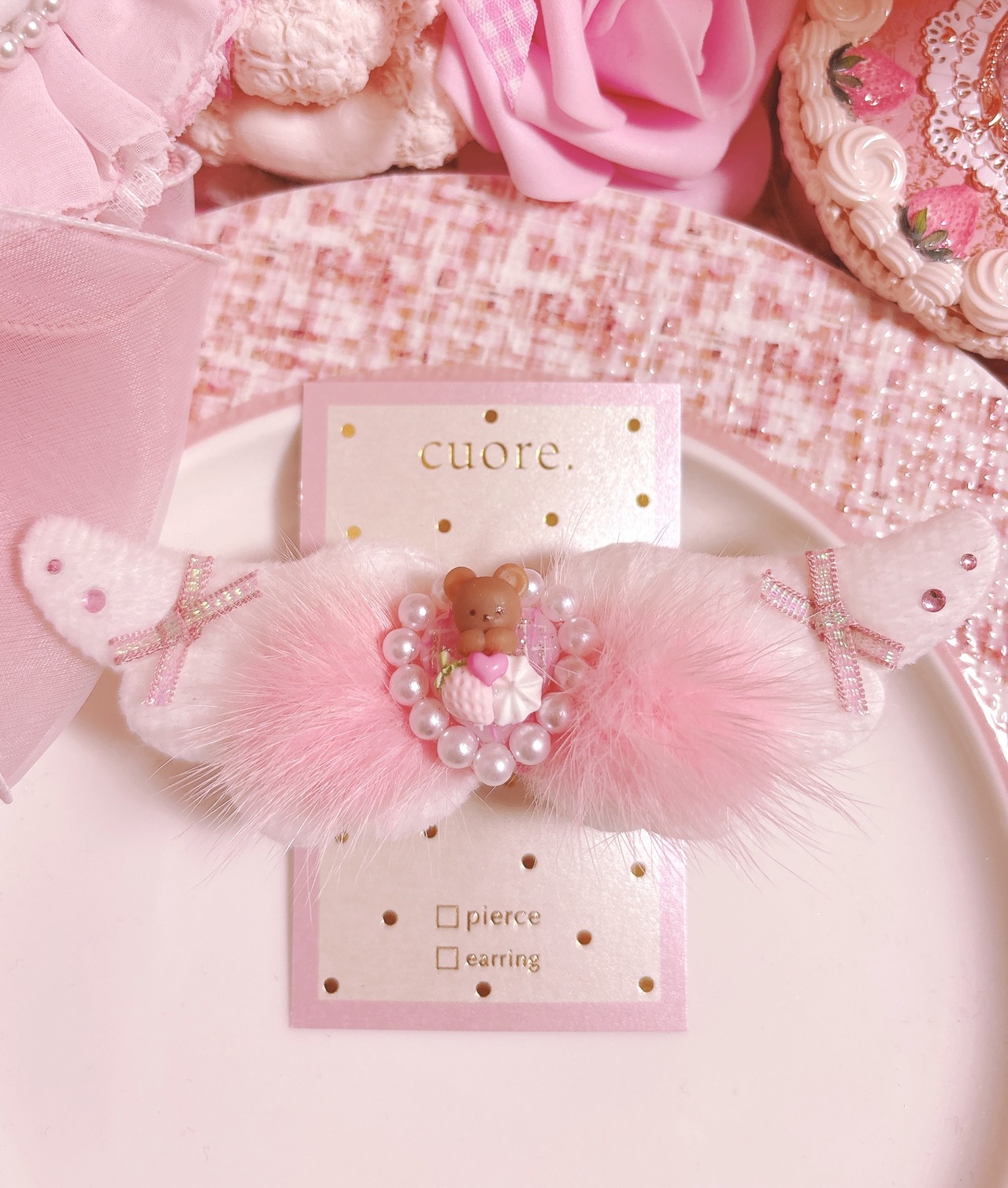 センターパーツには可愛いくまちゃんがちょこんと付いたシングルヘアクリップです。ふわふわミンクファーが可愛い!