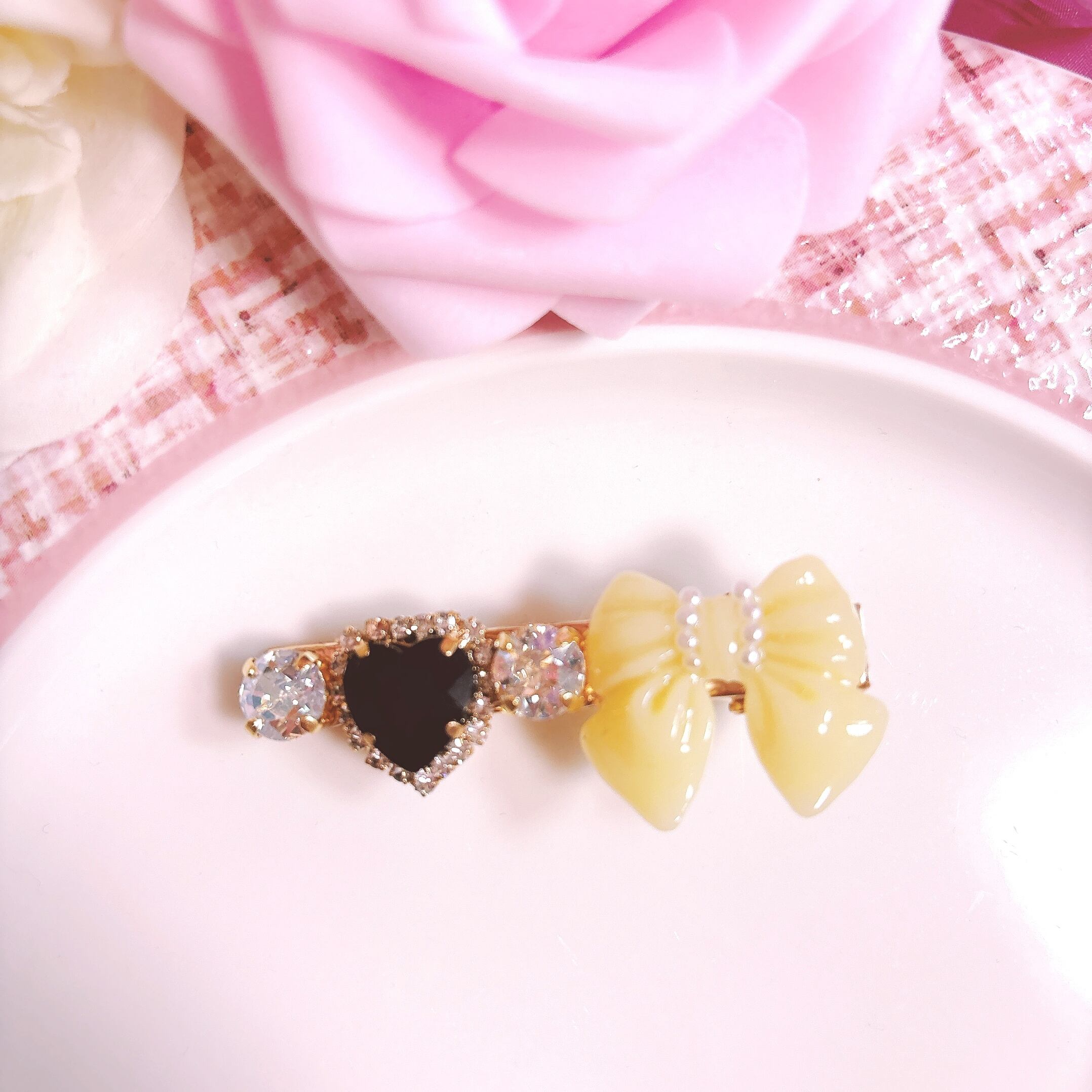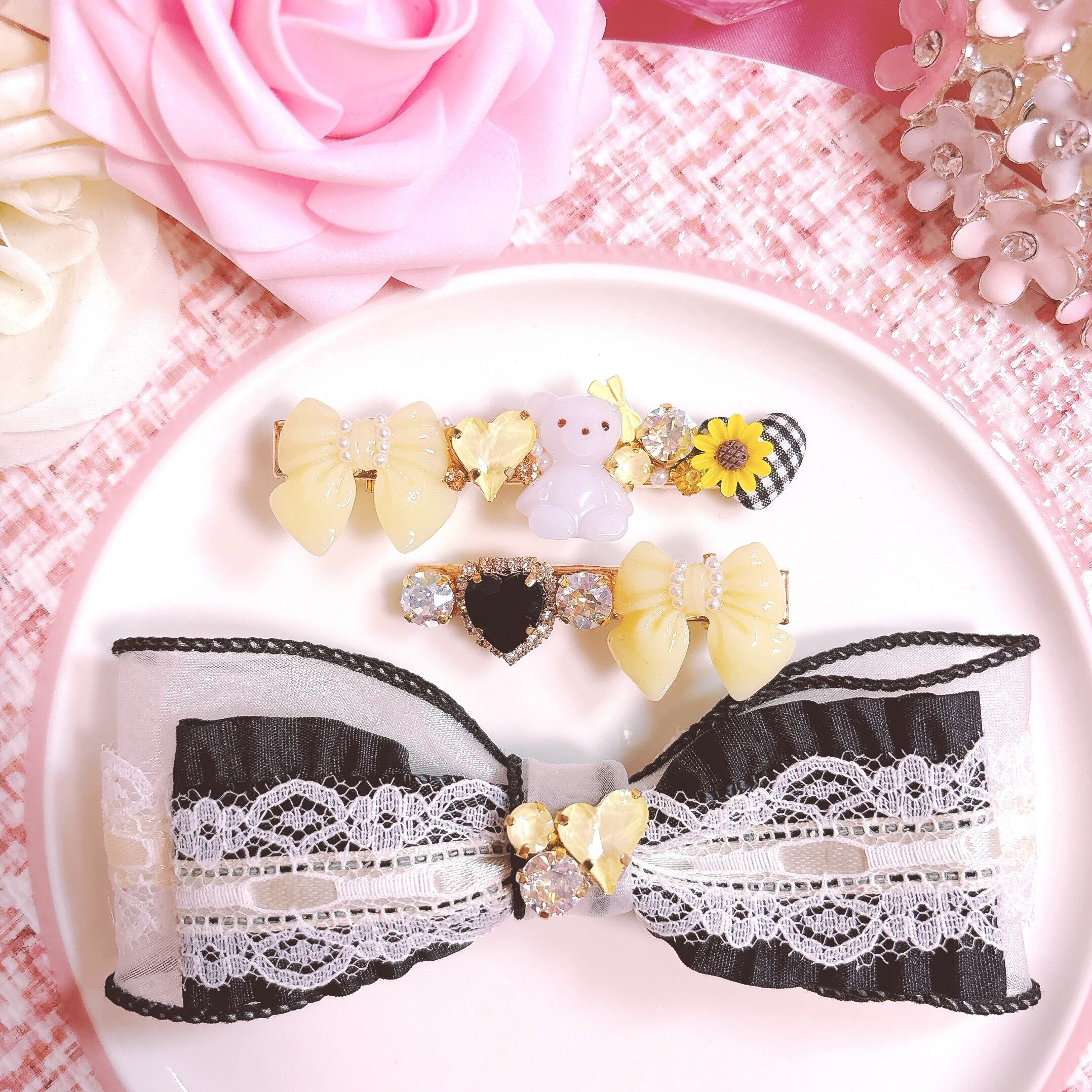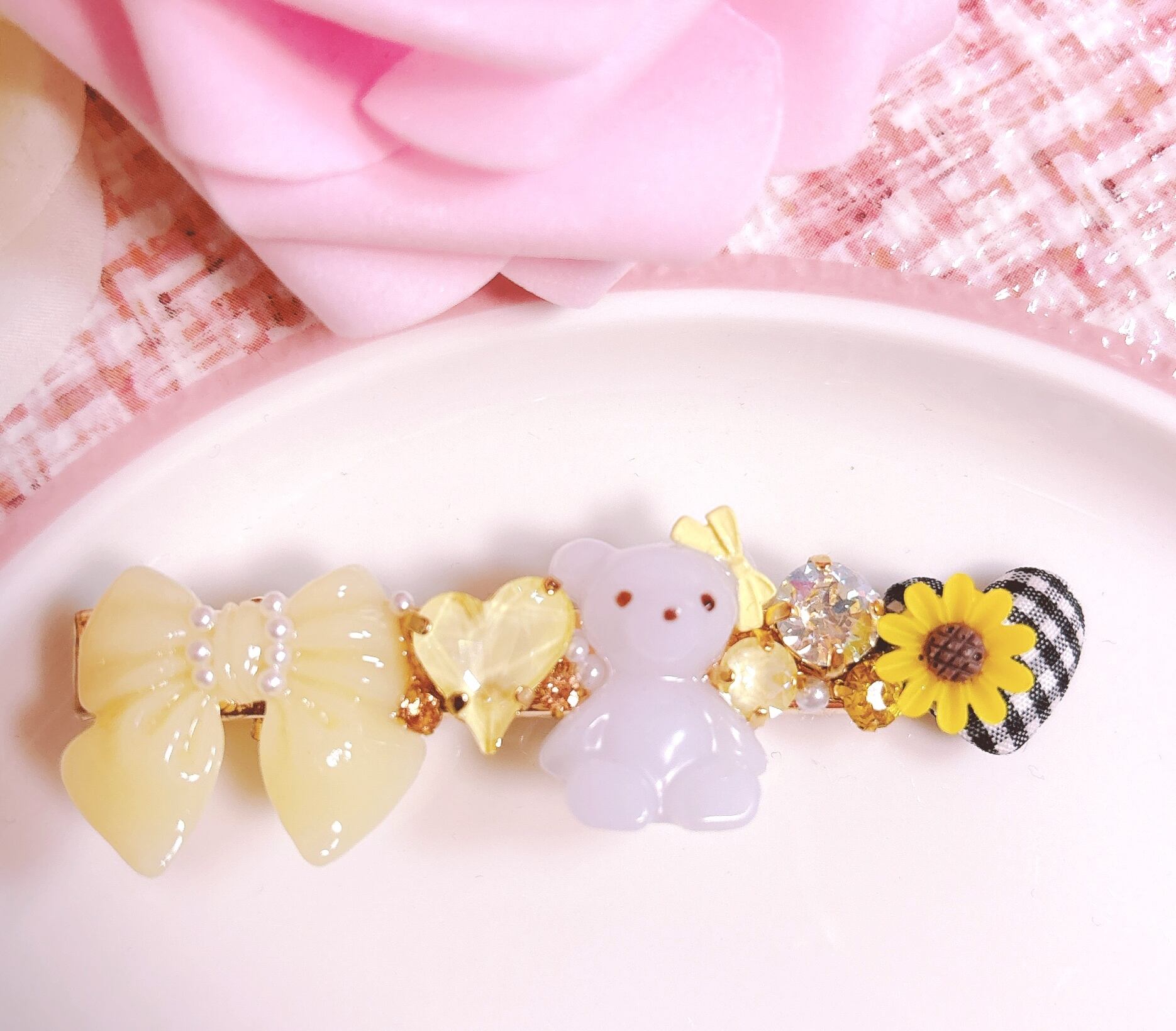くまちゃんとひまわりがポイントのヘアクリップは、ブラックとイエローの組み合わせが引き締めてくれ、大人可愛いデザインに♡